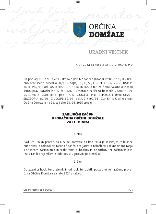 Zaključni račun proračuna Občine Domžale za leto 2024 (Št. 8 - 2025)