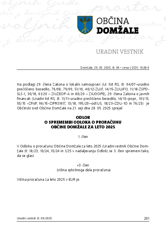 Odlok o spremembi Odloka o proračunu Občine Domžale za leto 2025 (Št. 9 - 2025)