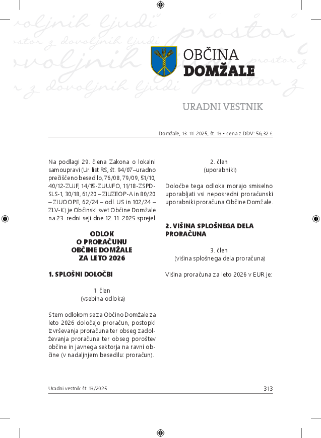 Odlok o proračunu Občine Domžale za leto 2026 (Št. 13 - 2025)