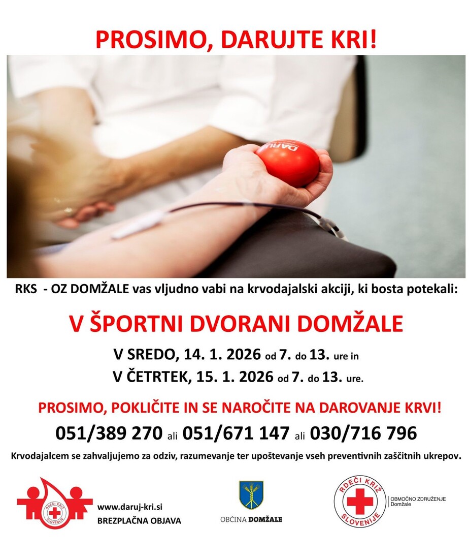 Vabimo vas, da se udeležite prve terenske krvodajalske akcije, ki bo potekala v sredo, 14. januarja, in četrtek, 15. januarja 2026 med 7. in 13. uro v Športni dvorani Domžale, Mestni trg 1.