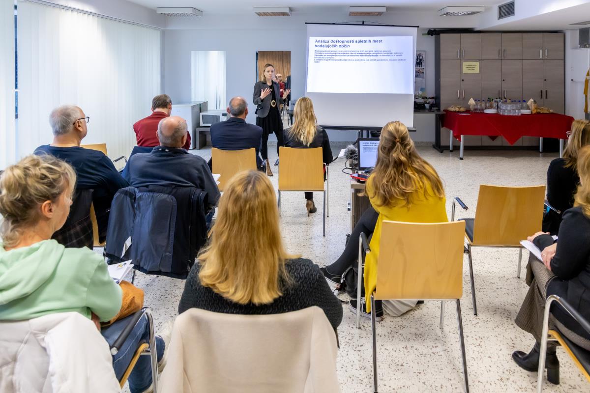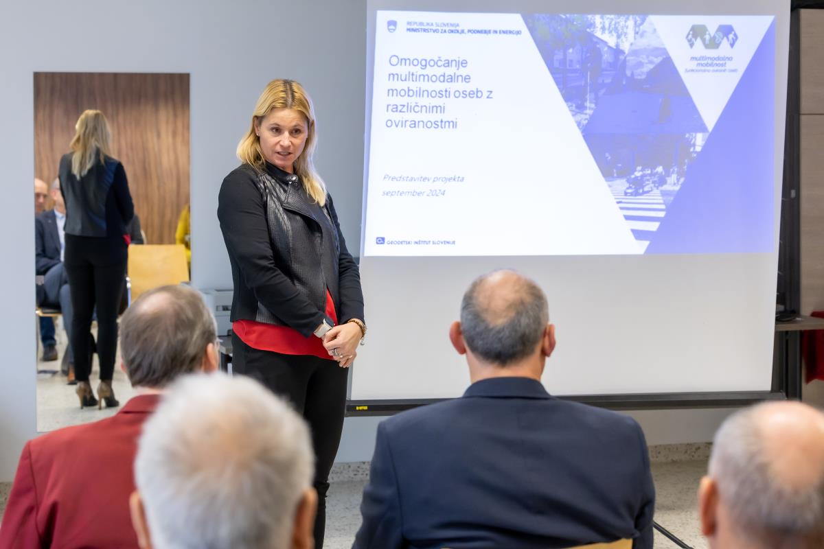 Mag. Roman Rener, vodja projekta na Geodetskem inštitutu, je predstavil razvoj projekta in njegove prihodnje smernice. Osrednja vizija je oblikovanje platforme Zgodba petih prostorov, ki bo združevala podatke in storitve v enotno državno platformo mobilnosti in spletne dostopnosti za invalide in starejše. Platforma bo vsebovala podatke o dostopnosti notranjih in zunanjih prostorov javnih objektov, spletnih storitvah, prevozih na klic ter rehabilitacijski vadbi, podprti s sodobno tehnologijo. Strokovna sodelavka na Geodetskem inštitutu Marina Lovrić je pojasnila, da zajem podatkov v občinah poteka digitalno, pri čemer podatke zbirajo invalidi sami. Ti podatki so dostopni v brezplačnem spletnem pregledovalniku in se uporabljajo za pripravo spletnih in tiskanih kart dostopnosti, akcijske načrte za odpravo ovir ter navigacijo v prostoru. Izpostavila je tudi nov participativni model, ki spodbuja sodelovanje med občinami, invalidskimi organizacijami in posamezniki, kar omogoča sprotno posodabljanje baze podatkov. Ko uporabniki naletijo na oviro, to sporočijo skrbnikom in steče postopek dodajanja lokacije v sistem, kar osebam z različnimi oviranostmi olajša načrtovanje poti, po drug strani pa občinam in organizacijam ponuja priložnost za odpravo ovir.