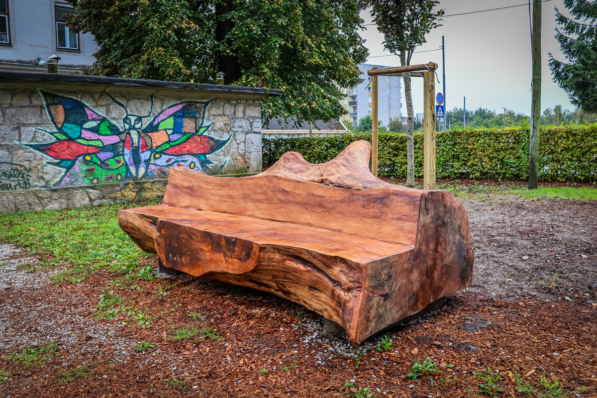 V sodelovanju z izvajalcem Mosaico, Gašper Repovž s.p., smo uresničili čudovit projekt. Mogočno drevo v parku Univerzale je zaradi propadanja moralo biti odstranjeno, vendar njegov les ni šel v pozabo. Iz najboljših delov debla sta nastali dve masivni, unikatni klopi, ki sta zdaj znova postavljeni v parku. Drevo je tako zaživelo v novi, trajni obliki – kot funkcionalni in estetski leseni skulpturi, ki krasita zeleni kotiček ter ohranjata spomin na naravo. Na mestu posekanega drevesa smo posadili tudi dve novi bukvi, ki bosta v prihodnosti poživili park.
