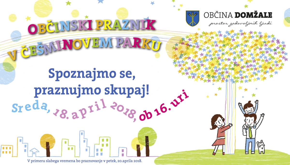 April je mesec, ko Občina Domžale praznuje rojstni dan. Tudi v letošnjem letu bomo pospremili občinski praznik z mnogimi dogodki, prireditvami in srečanji, s katerimi bomo obogatili družabno dogajanje in življenje v naši lokalni skupnosti. »Spoznajmo se, praznujmo skupaj« je medgeneracijski in zdaj že tradicionalen dogodek, s katerim želimo naš praznik praznovati z vami, občankami in občani. Praznovanje bo potekalo v sredo, 18. aprila 2018, od 16. ure dalje v Češminovem parku v Domžalah (v primeru slabega vremena se dogodek prestavi na petek, 20. april 2017).