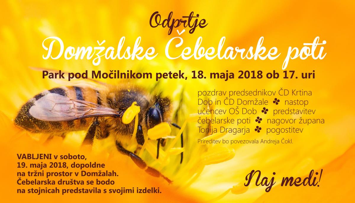 V počastitev svetovnega dneva čebel bomo v Domžalah slavnostno odprli novo Domžalsko čebelarsko pot, ki bo povezovala dva učna čebelnjaka in dve čebelarski društvi, ČD Krtina Dob in ČD Domžale. Vabimo vas na odprtje, ki bo v parku pod Močilnikom, v petek, 18. maja ob 17. uri. Pozdravila nas bosta predstavnika obeh društev, nastopili bodo učenci OŠ Dob, za glasbeno poslastico bosta poskrbela Polona Mežnar in Luka Gnidovec. Zbrane bo nagovoril tudi župan Občine Domžale Toni Dragar. Po vodenem ogledu dela čebelarske poti, bo sledila manjša pogostitev.