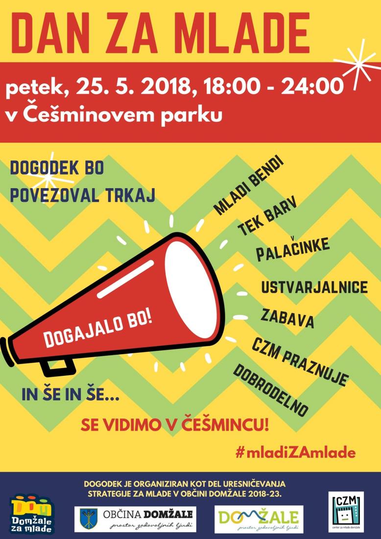 V Domžalah se bo v petek, 25. maja 2018, zgodil pravi praznik za mlade. Občina Domžale je v zadnjih letih izpostavila problematiko mladih in župan Toni Dragar je s pričetkom novega mandata leta 2014 ustanovil Komisijo za mladinska vprašanja, ki jo vodi podžupanja mag. Renata Kosec. Izvedena je bila obširna anketa med mladimi Domžalčani (15 – 30 let) z glavnim vprašanjem »Kaj mladi, potrebujejo, pogrešajo in iščejo v Domžalah?«. Na podlagi rezultatov je bila oblikovana Strategija za mlade v občini Domžale, ki bo javnosti predstavljena na Dnevu za mlade, 25. maja, v Češminovem parku. Praznovanje sovpada z 20-letnico delovanja javnega zavoda Center za mlade in praznovanjem prvega leta TIC Domžale. Dogodek bo povezoval Trkaj - Rok Terkaj PolnProfil, ki je tudi slovenski kulturni ambasador. Slogan dogodka je »mladi za mlade«.