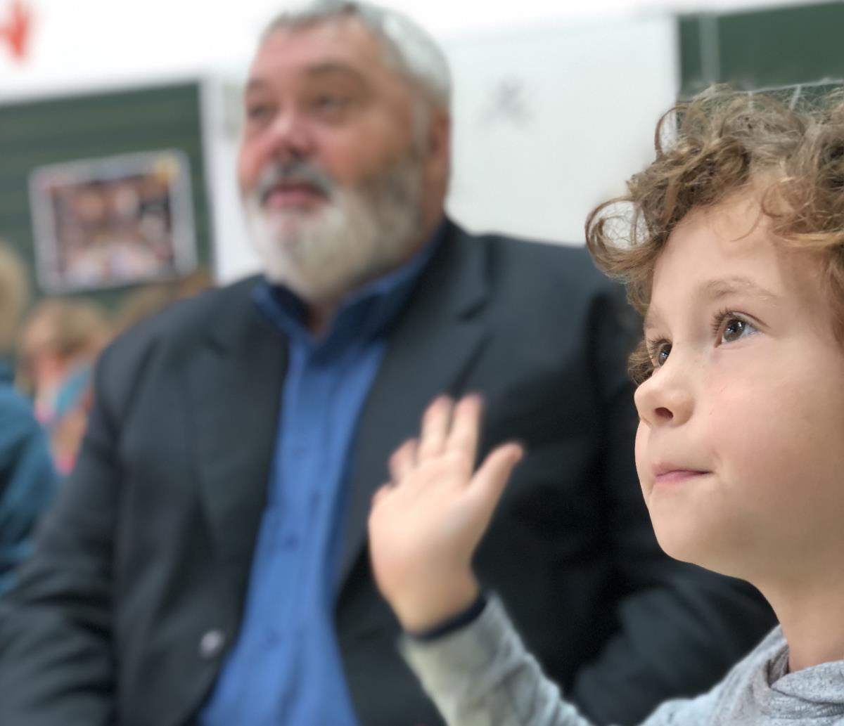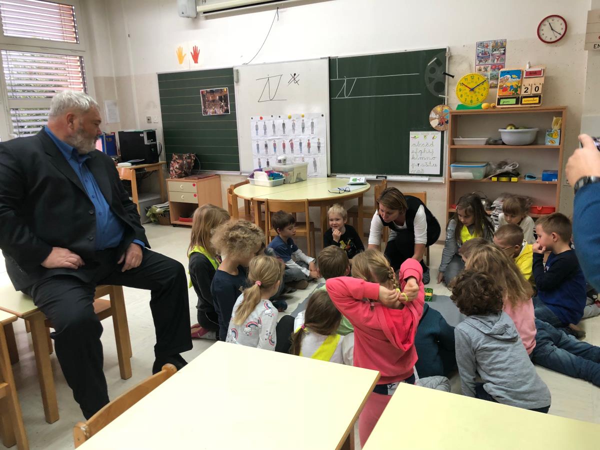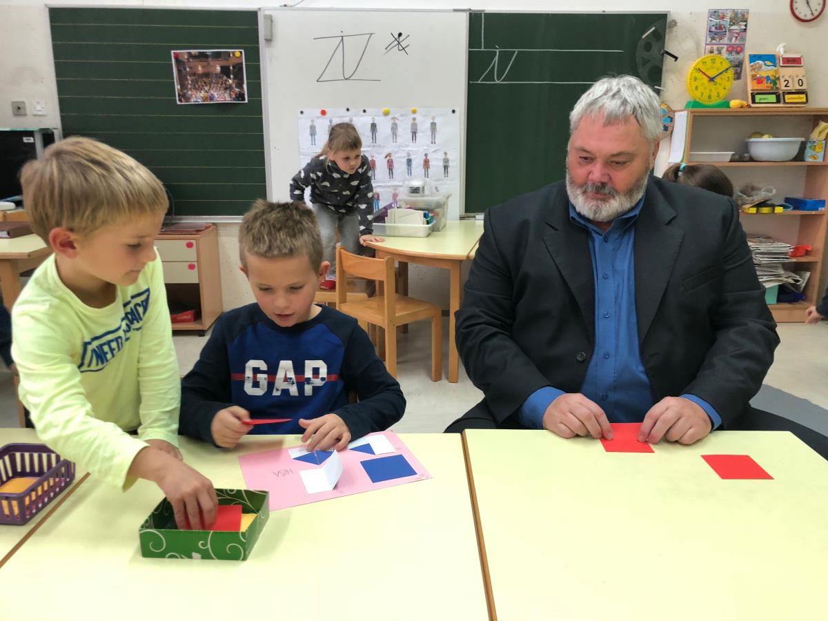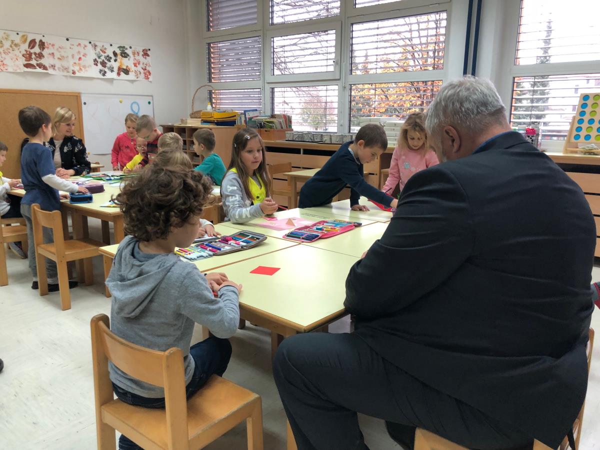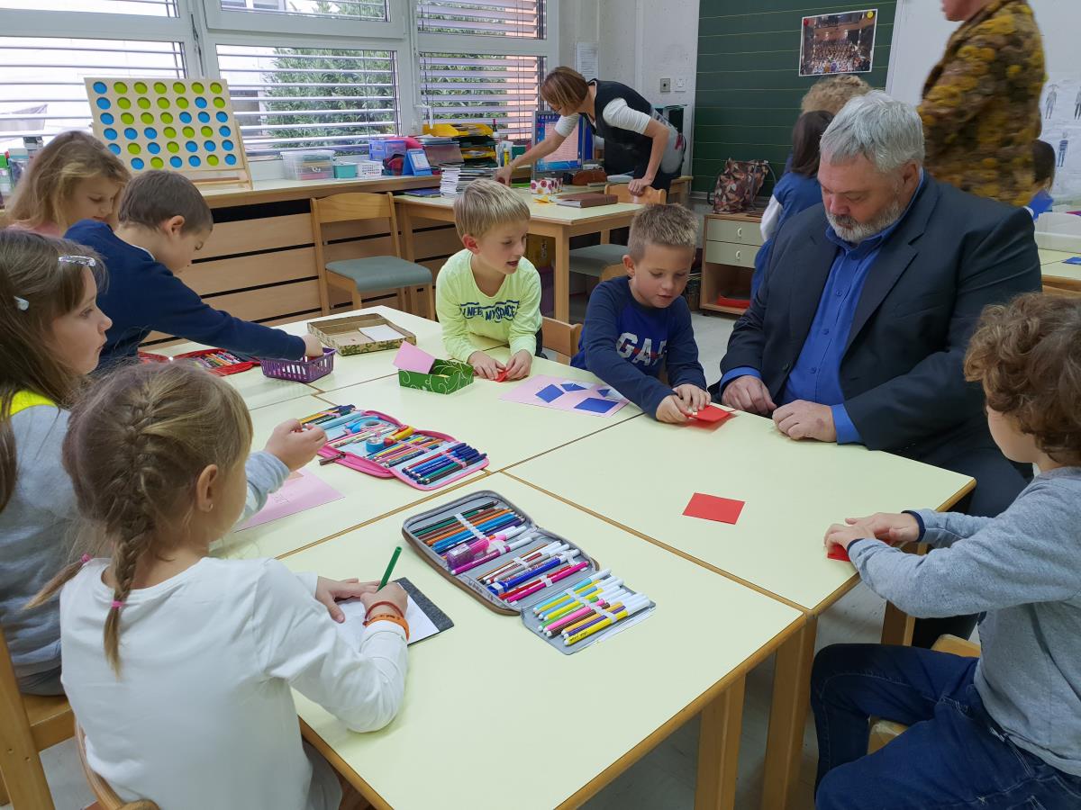 Župan Toni Dragar in podžupanja mag. Renata Kosec sta danes obiskala 1.b razred OŠ Venclja Perka in otrokom povedala, kako zelo jih odrasli spoštujemo in upoštevamo. Z njimi sta pri šolski uri sedela za mizo, barvala in zgibala origami. Občinska stavba bo v znak podpore otrokom danes obarvana v modro barvo.