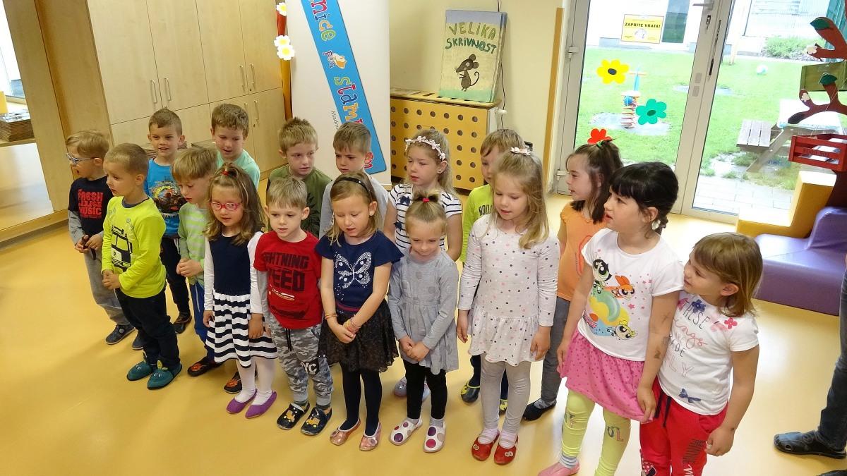 V uvodu je vse zbrane pozdravila in nagovorila Nina Mav Hrovat, ki je iz svoje »malhe« potegnila Mačka Murija, Pedenjpeda in Muco Copatarico, plišaste živalce, katerih so se otroci zelo razveselili. V pogovoru so otroci razkrili, da najraje berejo slikanice, pravljice pa tudi pesmice. Anže Miš je v nadaljevanju podaril knjige vzgojiteljicam, ki so jih ob odhodu domov prejeli vsi otroci, ki jeseni odhajajo v šolo, da jih bodo lahko doma s starši prebirali. Otroci, ki ostanejo v vrtcu še eno leto, pa so tudi prejeli nove knjige, ki jih bodo imeli vsak dan na voljo v knjižnih kotičkih in v knjižnici vrtca. Po obdaritvi so si gostje ogledali knjižne kotičke in vrtčevsko knjižnico, otroci pa so se vrnili v igralnice in pogledali, kaj novega jih čaka v njihovih knjižnih kotičkih.