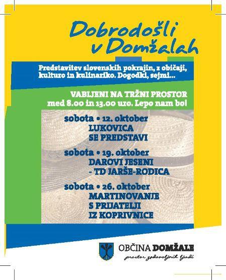 Vabljeni na Tržni prostor v Domžale, kjer se nam bodo v soboto, 12. oktobra med 8.00 in 13.00 uro predstavili sosedje iz Lukovice.