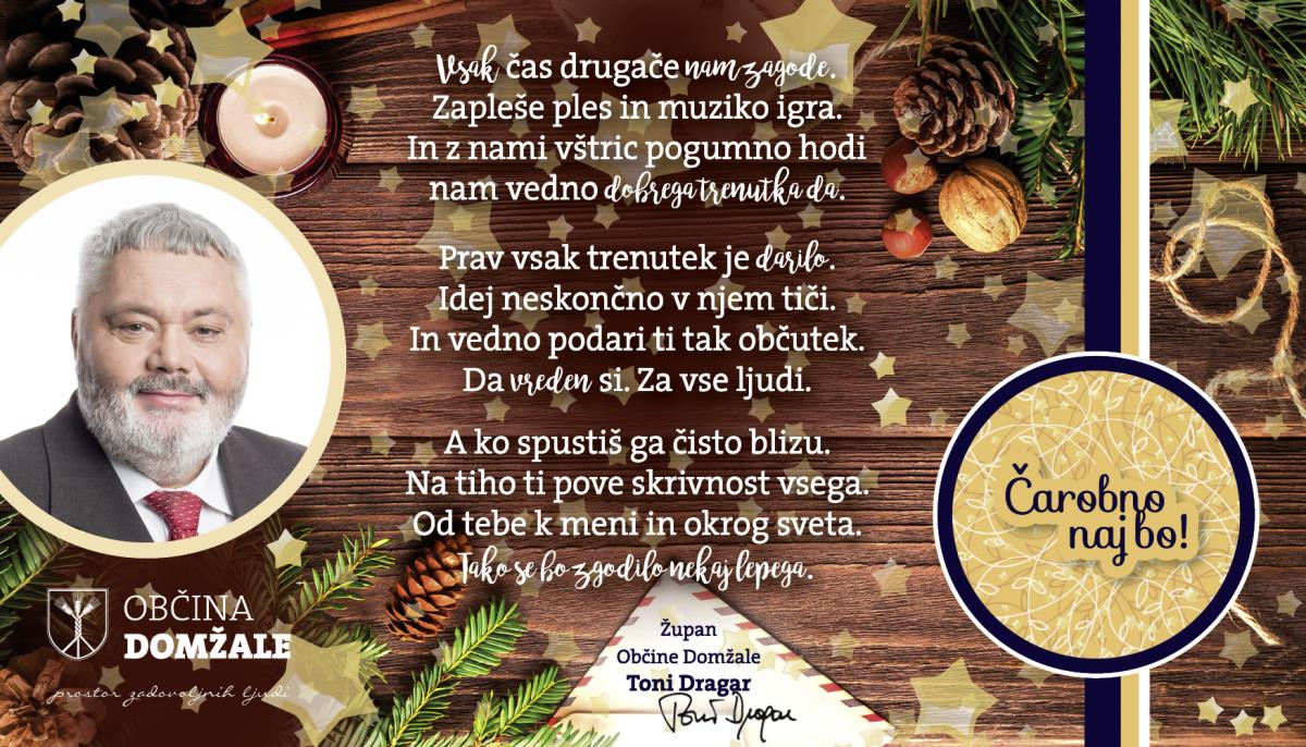 Naj za trenutek pozabimo na prav vse, z mislimi poglejmo skozi celo leto in mu recimo hvala. Sam sem v tem letu hvaležen za vse dobre ljudi.. med njimi sem videl ogromno dobrote, solidarnosti, pozitive in to me navdaja z upanjem o boljšem jutri. Videl sem ogromno dobro izpeljanih projektov, vesel sem za vse pomembne večje investicije, ki smo jih uspeli izpeljati in tiste drobne majhne, ki jih morda skoraj nihče ni opazil. Videl sem zaposlene v službah, ki dihajo za nas, za našo varnost. Skrbijo za naše zdravje in se ne sprašujejo zakaj. Videl sem nasmejane otroke na naših igralih širom Domžal, ki so svojim staršem risali nasmehe na obraze. Starostnike, ki so hvaležno sprejemali drobne pozornosti drugih ljudi, sosede, ki so brez vprašanja priskočili na pomoč pri popravilu strehe, naše »mladince«, ki so poskrbeli za ranljive skupine. Videl sem življenje. Na drugi strani pa sem opazil tudi skrbi, žalost, bolezen in obup. Sprejemal sem kritike in obtožbe, na račun sebe in našega dela. Večinoma zaradi nepoznavanja, neupravičeno. Vedno se trudimo, da v naši občini poskrbimo za dobrobit vseh tam, kjer lahko. Zelo pomembno je zavedanje, da vsa področja niso v naši domeni, da službe, ki izvajajo določene dejavnosti niso v naših rokah in nanje nimamo in ne smemo imeti vpliva, ne dovolite pa, da vam ne bi pomagali tam, kjer imate vso pravico do naše pomoči.