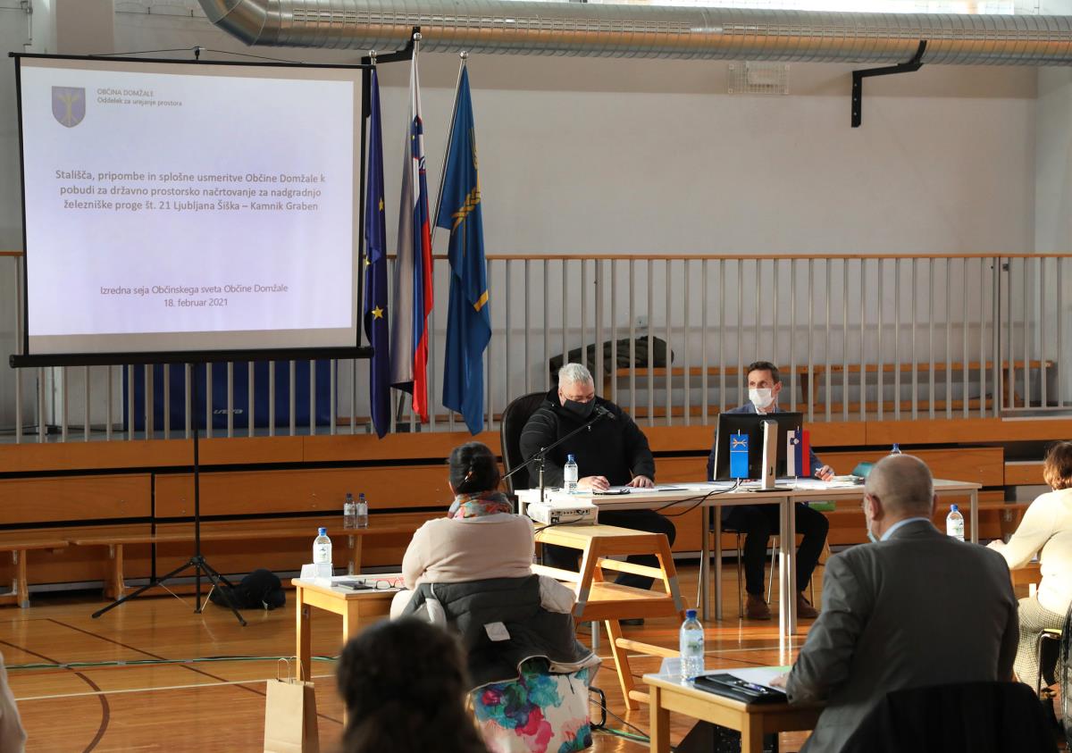Domžalske občinske svetnice in svetniki so se v četrtek, 18. februarja 2021, na predlog župana Občine Domžale Tonija Dragarja, sestali na izredni seji Občinskega sveta Občine Domžale na kateri so obravnavali dve točki dnevnega reda. »Seznanitev s pobudo o nadgradnji železniške proge in sprejem stališč« ter »Soglasje k imenovanju direktorja Zavoda za šport in rekreacijo Domžale«. Izredna seja je potekala v telovadnici Podružnične osnovne šole Ihan.