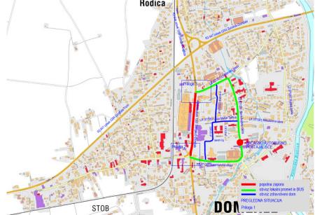 Začasno se ukineta tudi obe avtobusni postajališči v centru Domžal ob veleblagovnici. Kot začasni avtobusni postajališči bosta služili že obstoječi postajališči pri stavbi Univerzale, ki bosta ustrezno označeni. Obvoz za avtobusni promet bo potekal v smeri Ljubljanska cesta, Slamnikarska cesta, Karantanska cesta in obratno.
