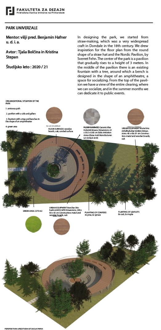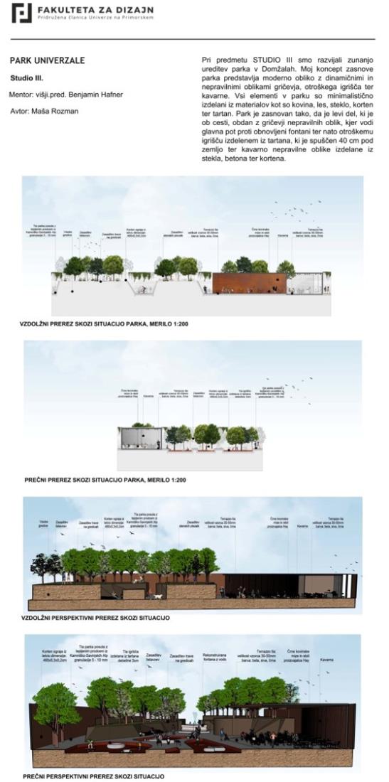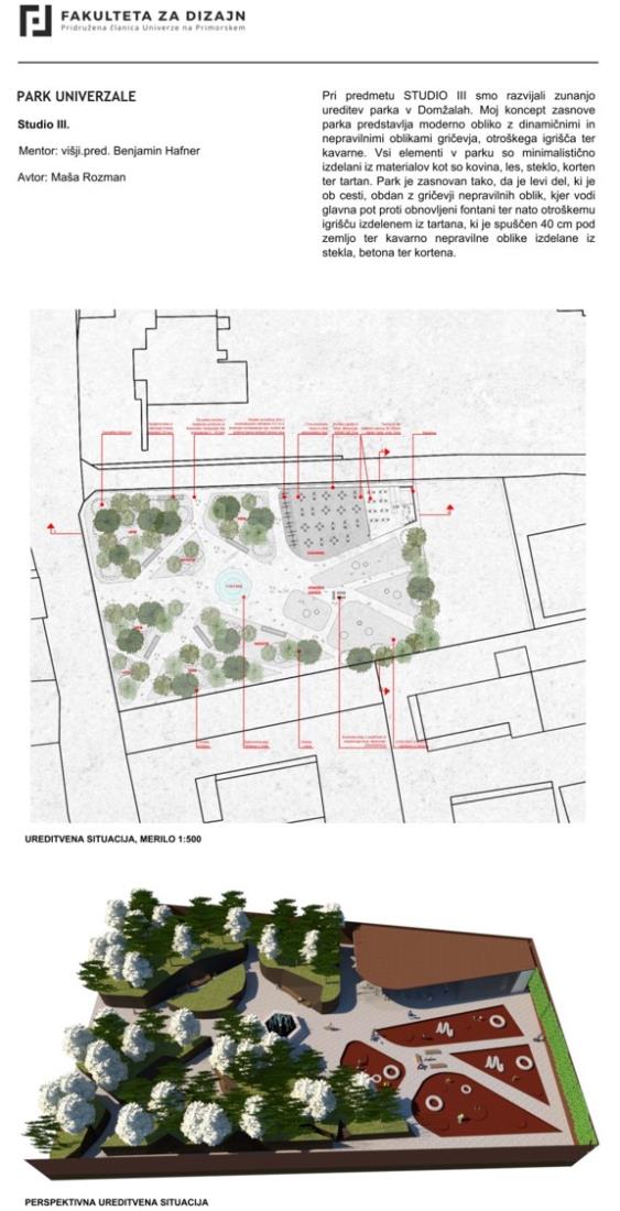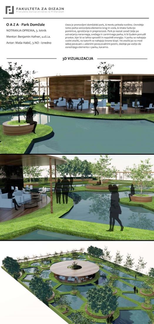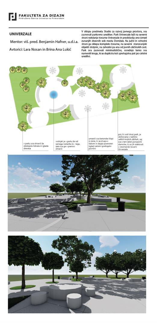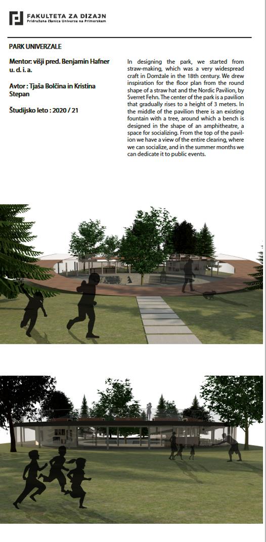 Občina Domžale sodeluje tudi s Fakulteto za design, naše zadnje skupno sodelovanje pa se je zgodilo meseca junija, ko so študentje fakultete predstavili svojo razstavo konceptualnih rešitev prenove parka Univerzale. Razstava je bila fizično postavljena v parku Univerzale.