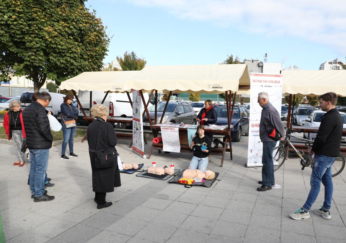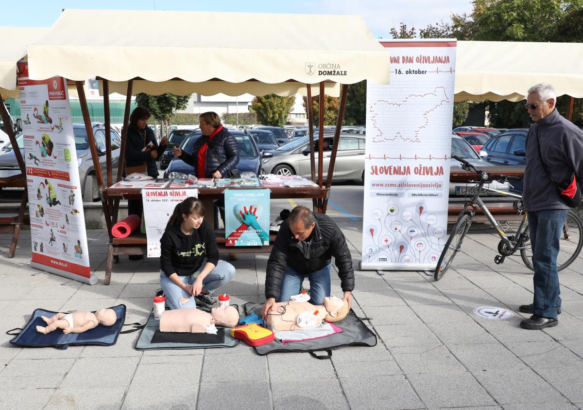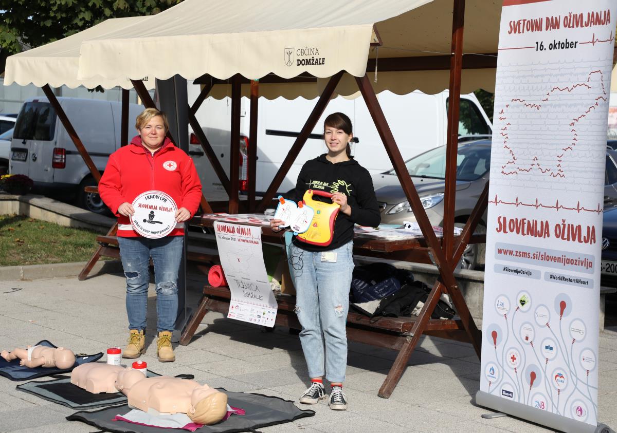 V soboto 16. oktobra 2021 obeležujemo Svetovni dan oživljanja. V okviru Svetovnega dneva oživljanja je danes tudi v Domžalah potekala akcija Slovenija oživlja. Globalni akciji ozaveščanja so se pod okriljem Zveze študentov medicine Slovenije tudi letos pridružili študenti medicine iz obeh slovenskih fakultet, skupaj s študenti petih zdravstvenih fakultet, člani Zveze tabornikov Slovenije, člani Zveze slovenskih katoliških skavtinj in skavtov ter predstavniki območnih združenj Rdečega križa Slovenije. Prisotna je bila tudi sekretarka OORKD, ga. Majda Mernik. Na Tržnem prostoru v Domžalah so tako prikazali uporabo defibrilatorja in obiskovalce ozaveščali o temeljnih postopkih oživljanja.