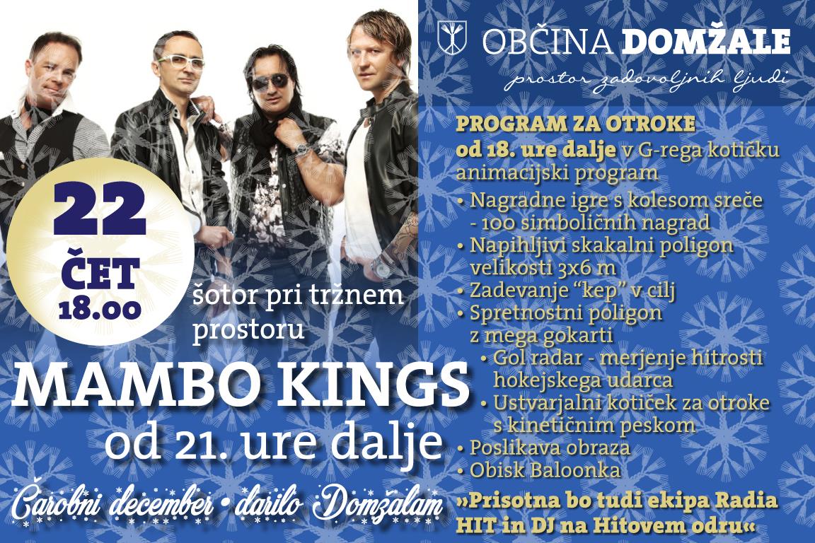 V četrtek, 22. decembra 2016, bomo z dogajanjem začeli ob 18. uri pred šotorom na tržnem prostoru v centru Domžal. Pripravljen je bogat program za otroke, ki ga bodo vodili animatorji G-rega. Voditelji radia HIT pa bodo poskrbeli za vse starejše s pestrim dogajanjem. Ob 21. uri se bo začelo dogajanje v šotoru, ko bodo na oder prišli Mambo Kings, ki nas bodo zabavali vse do 2. ure zjutraj.