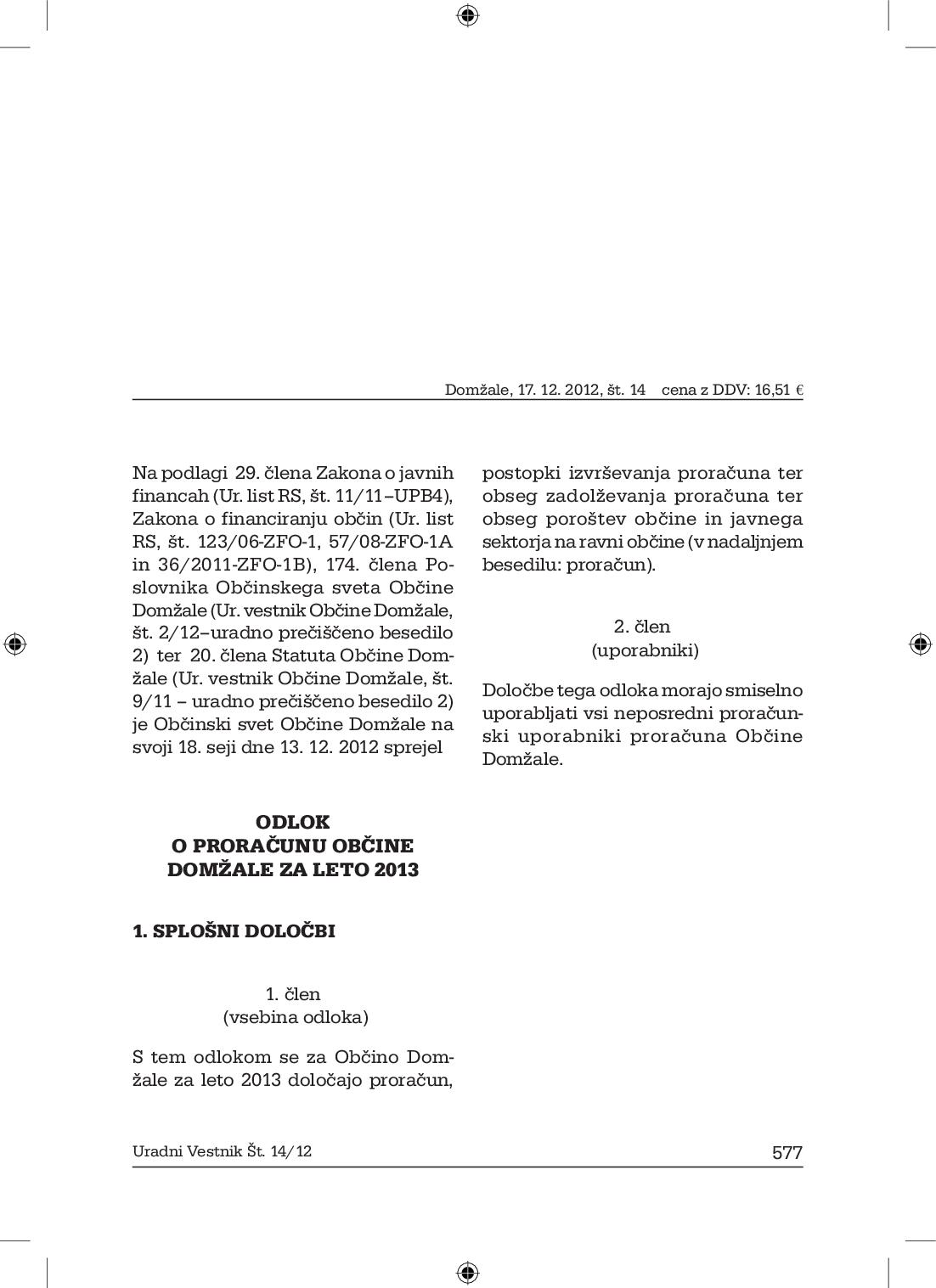 Odlok o proračunu Občine Domžale za leto 2013 (Št. 14 - 2012)
