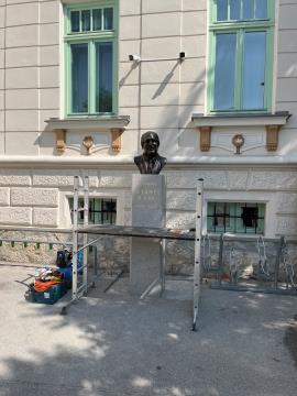 Na podlagi v proračunu zagotovljenih sredstev v letih 2020, 2021 in 2022 je bila imenovana komisija za postavitev obeležja Stanetu Habetu. Prvotna ideja je bila, da mora biti kip v naravni velikosti in iz brona, komisija pa je veliko razpravljala tudi o lokaciji postavitve. V letu 2022 je bilo objavljeno javno povabilo za oddajo ponudb za izdelavo kipa. Na povabilo sta se odzvala dva umetnika, kiparja, pri čemer je pogojem povabila ustrezala ideja enega, ki pa za komisijo in najbližje sorodnike ni bila sprejemljiva. Eden od umetnikov, ki sicer ni izpolnjeval pogojev, pa je vendarle izdelal tudi sorodnikom všečno idejno rešitev, in sicer doprsni kip Staneta Habeta. V proračunu za leto 2023 so se za dokončno postavitev zagotovila zadostna proračunska sredstva. Doprsni kip s podstavkom je na ogled v notranjem dvorišču Kulturnega doma Franca Bernika Domžale. Kip je delo akademskega kiparja Anžeta Jurkovška.