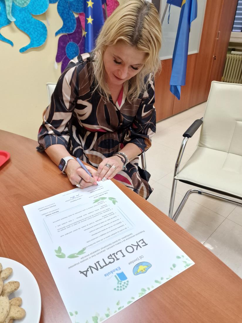 V petek, 27. oktobra 2023, dopoldan so županja mag. Renata Kosec, ravnateljica Nina Valenčič, nacionalni koordinator Ekošole mag. Gregor Cerar, predstavnica učiteljev Renata Avbelj in predstavnica učencev Fikreta Mešanović podpisali ekolistino. Na listino so učenci zapisali, katere dejavnosti v okviru Ekošole bodo izvedli in za katere dosegljive cilje si bodo prizadevali v naslednjih letih.