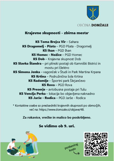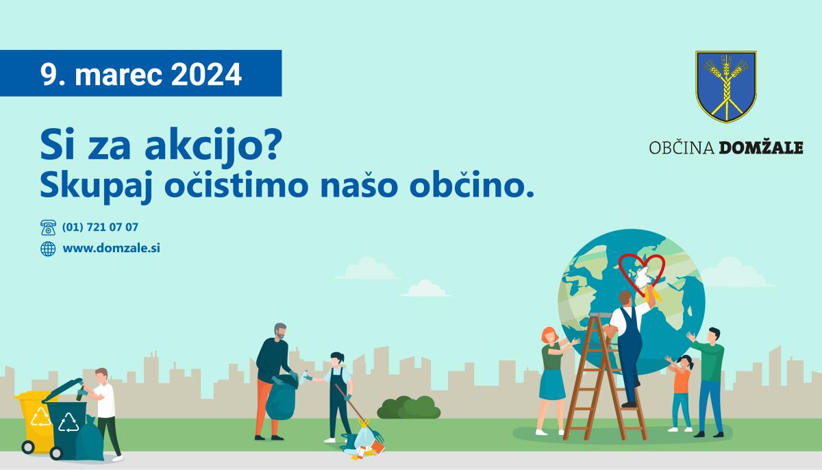 Krajani, društva, javni zavodi, druge organizacije in podjetja ter zaposleni na Občini Domžale, ki smo že potrdili sodelovanje, vabimo občanke, občane in druge prostovoljce, da se nam pridružite. Za vse sodelujoče bodo zagotovljene zaščitne rokavice, vrečke in malica. Gremo skupaj v akcijo, da bo naša občina čisto čista. Se vidimo v soboto, 9. marca 2024, ob 9. uri na zbirnih mestih:
