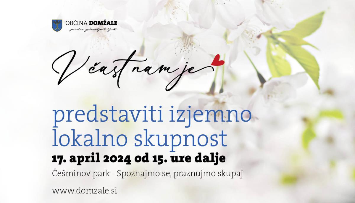 Eden večjih dogodkov bo zagotovo »Spoznajmo se, praznujmo skupaj« - tradicionalni medgeneracijski dogodek, s katerim želimo naš praznik praznovati z vami, našimi občankami in občani. V čast nam bo praznovati skupaj z vami, zato vas vabimo, da se nam v sredo, 17. aprila 2024, od 15. do 18. ure v Češminovem parku v Domžalah pridružite pri praznovanju, da se spoznamo, družimo in zabavamo.