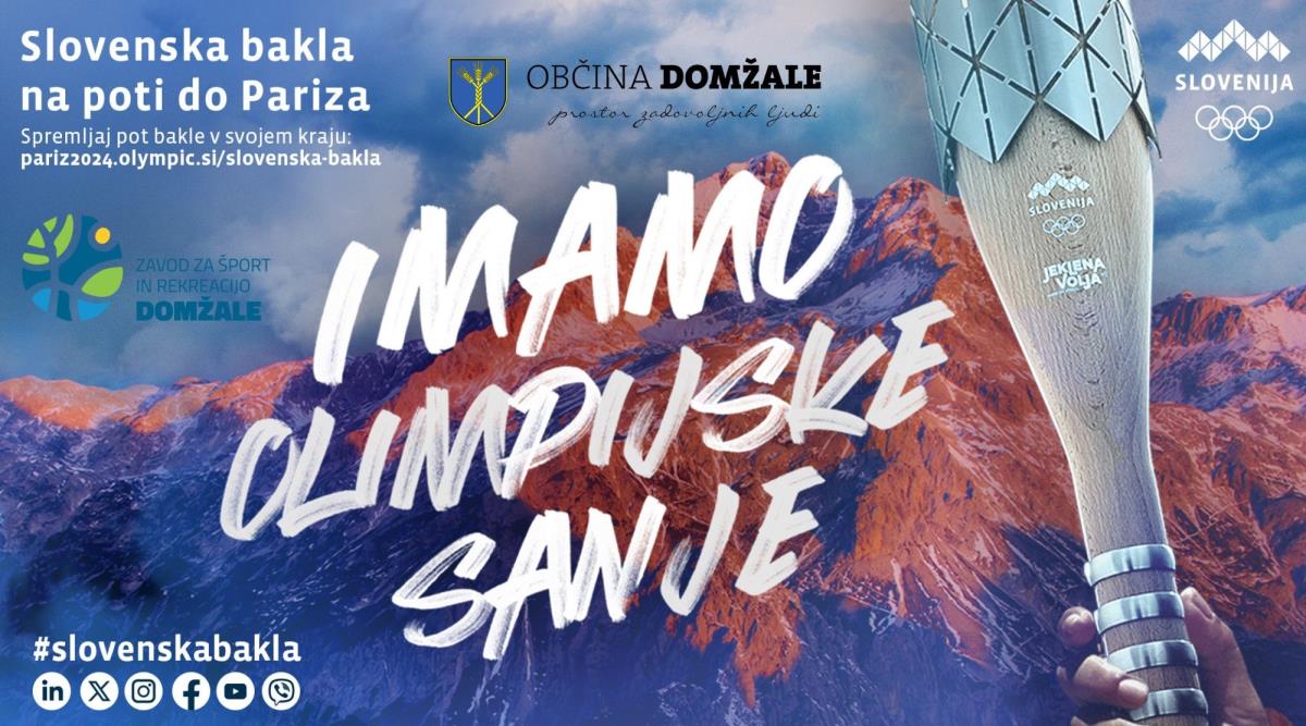 V četrtek, 9. maja 2024, ob 11. uri bo v domžalsko občino prispela Slovenska bakla, ki se je na pot podala 17. aprila, natanko 100 dni pred odprtjem letošnjih olimpijskih iger v Parizu. Slovensko baklo bodo od predstavnikov občine Trzin prevzeli domžalski kolesarji, športnica leta Lucija Hribar in športnik leta Lovro Planko, utramaratonec Tomaž Kališnik ter županja mag. Renata Kosec pa bodo z baklo pritekli do Stadiona Domžale, kjer se bodo dogodku pridružili tudi drugi in s tekom z baklo na stadionu simbolično pospremili slovenske vrhunske športnice in športnike na pot k olimpijskim dosežkom. V Pariz na igre potujeta tudi naša občana Lucija Hribar, gimnastičarka, in Žiga Ravnikar, lokostrelec.