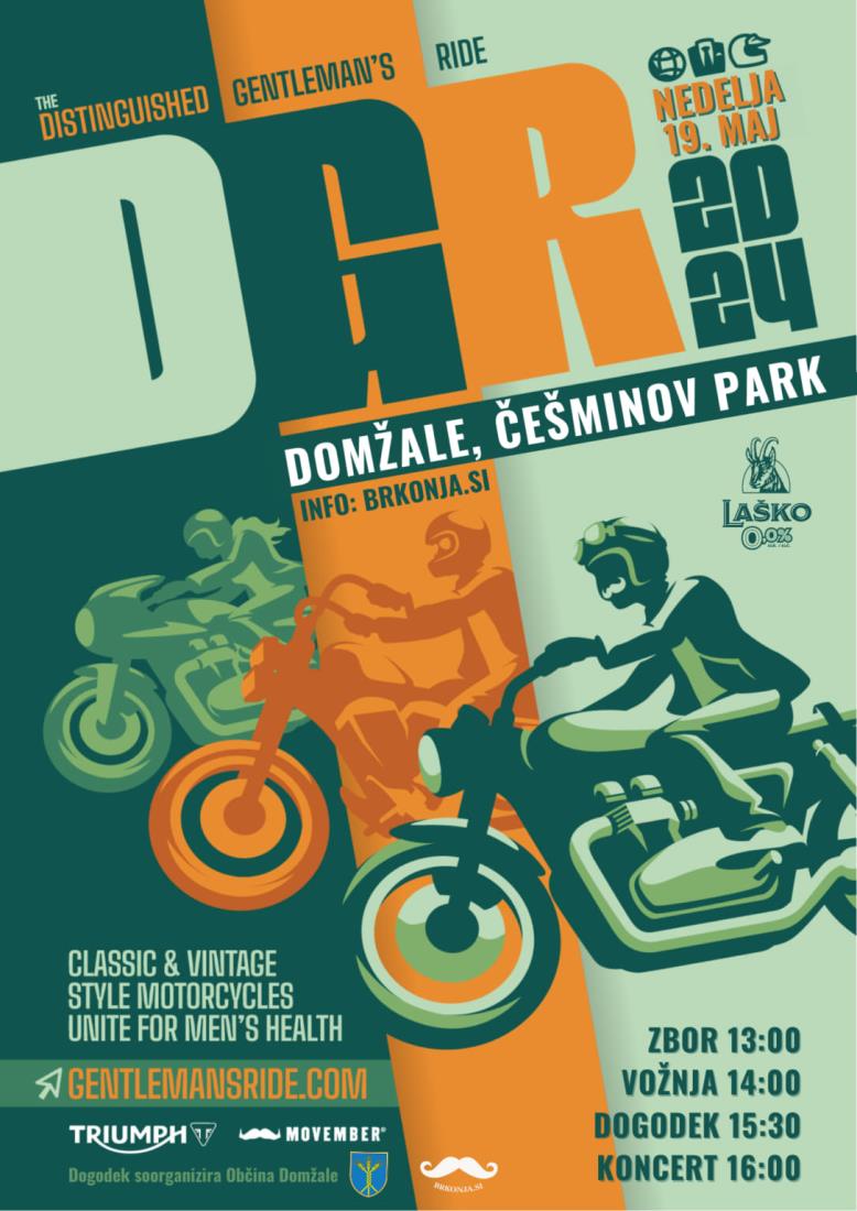 Z velikim ponosom vabimo na 12. dobrodelno vožnjo Distinguished Gentleman’s Ride 2024, ki bo potekala v nedeljo, 19. maja 2024, od 13. ure dalje v Domžalah. Dogodek, ki bo združil več kot 200 uglajenih motoristov iz vse Slovenije, bo poklon izjemnemu namenu — ozaveščanju o duševnih stiskah moških, njihovi tesnobnosti, depresiji, o preprečevanju moške samomorilnosti in o pomembnosti rednega samopregleda za zgodnje odkrivanje raka na prostati. Dogodek organizira društvo Brkonja ob podpori Občine Domžale.